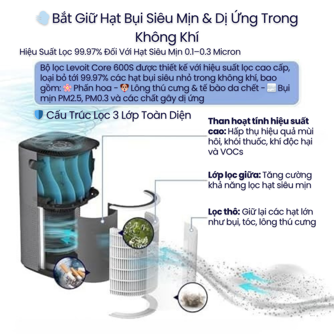 Çông nghệ lọc 3 lớp (3‑Stage Filtration) bắt giữ tối ưu bụi mịn, phấn hoa, khói, VOCs và mùi hôi từ nhà bếp, thú nuôi.
