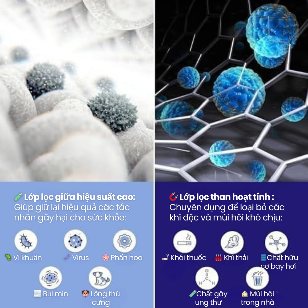 Lớp than hoạt tính mật độ cao giúp hấp thụ mùi hôi, khói thuốc, VOCs – giữ không khí sạch và tươi mới mỗi ngày.
