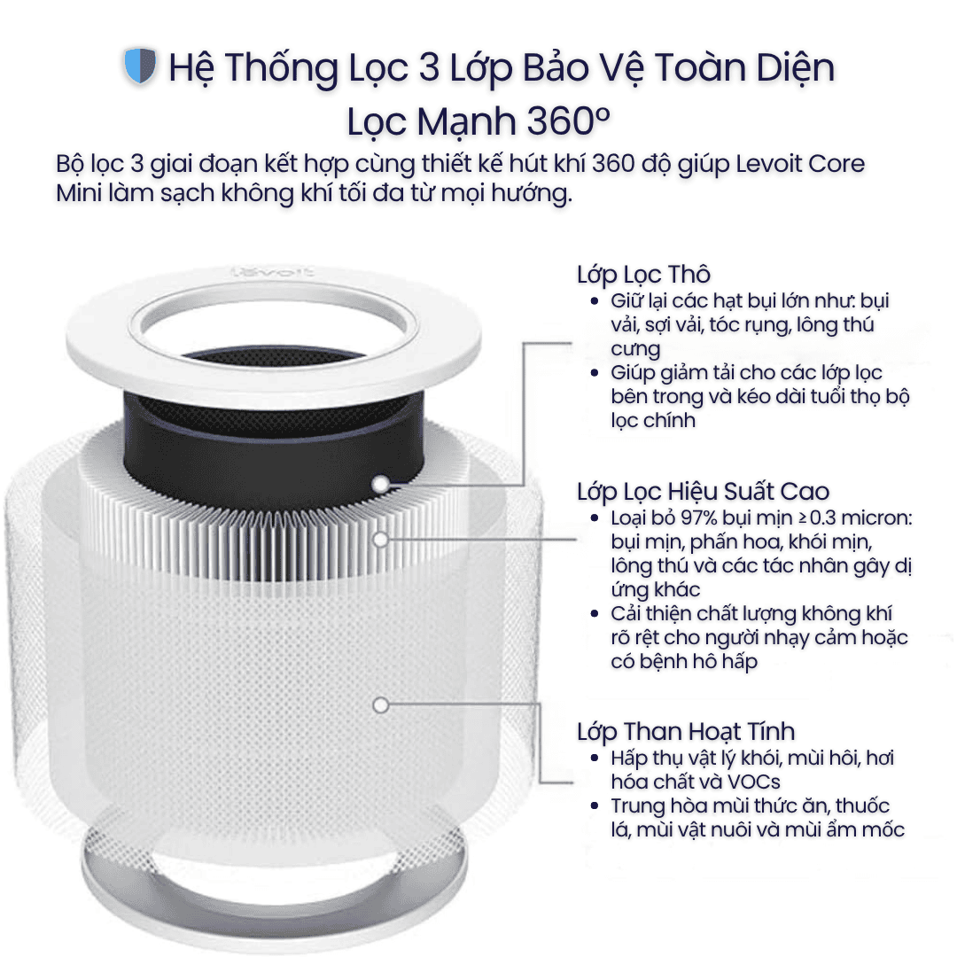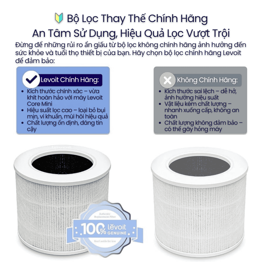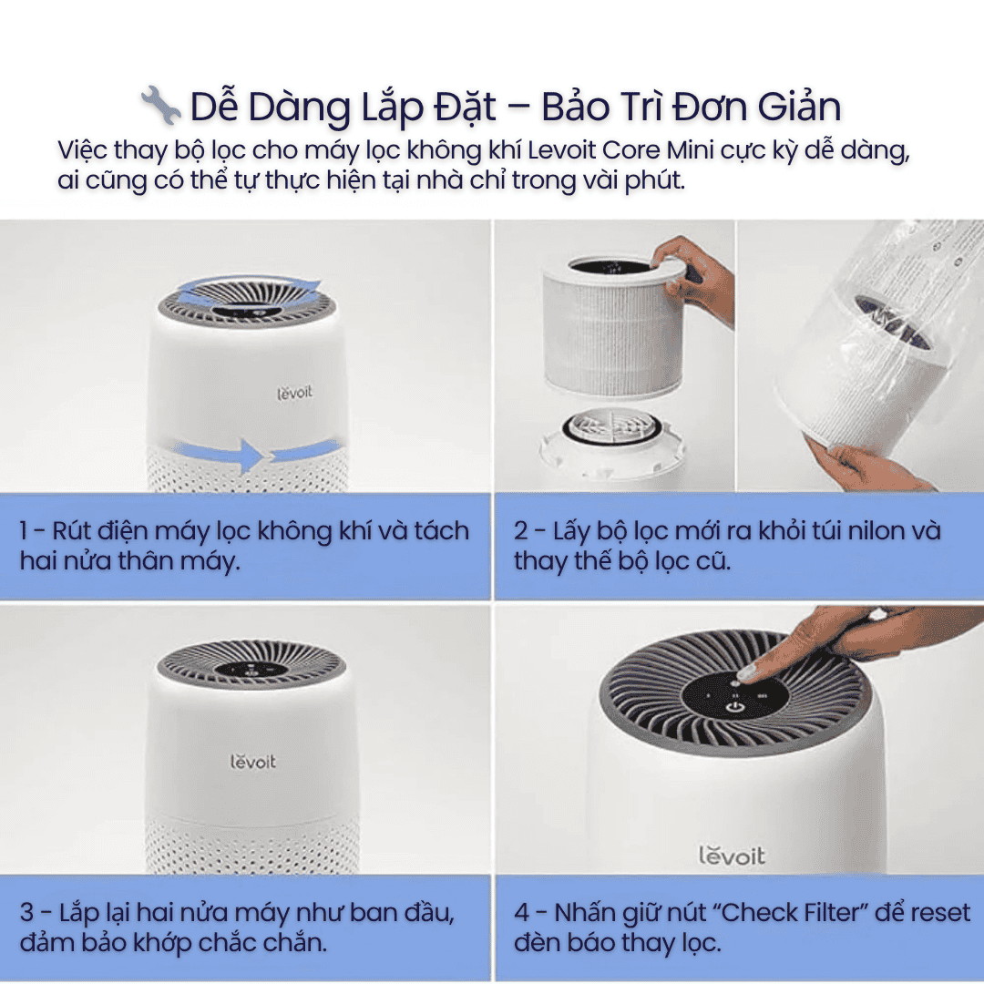 Levoit Core Mini là dòng máy lọc không khí nhỏ gọn, vận hành êm ái, lý tưởng cho không gian cá nhân như phòng ngủ, bàn làm việc hay phòng trẻ em. Để thiết bị hoạt động hiệu quả lâu dài, việc thay thế bộ lọc đúng loại, đúng thời gian và đúng cách là vô cùng quan trọng.