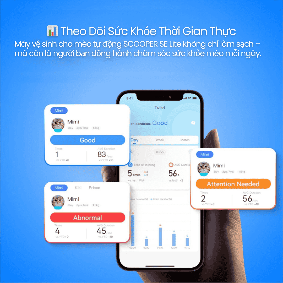 Ghi nhận tần suất đi vệ sinh, hành vi bất thường và lịch sử sử dụng để phát hiện sớm dấu hiệu bệnh lý.