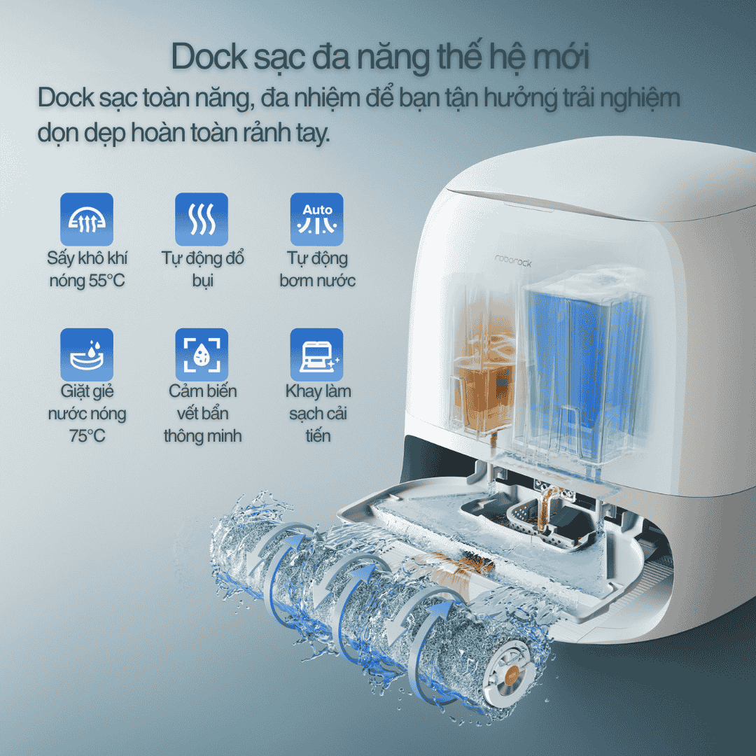 Dock có hệ thống bơm nước sạch và xả nước bẩn tự động, đảm bảo robot luôn lau bằng nước sạch 100%. Người dùng chỉ cần thay nước định kỳ vài ngày một lần, cực kỳ tiện lợi.