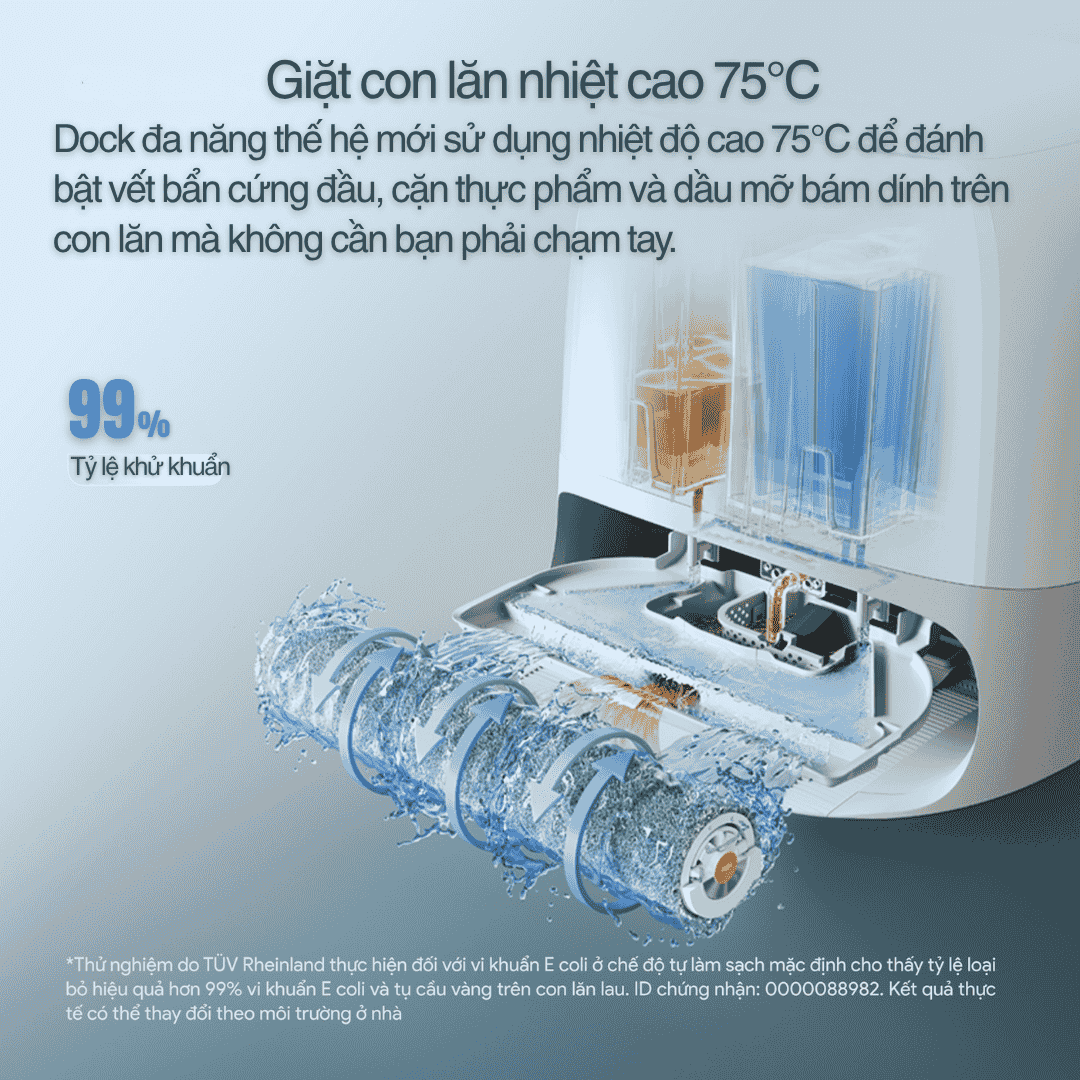 Sau khi giặt, robot sẽ tự động sấy khô bằng luồng khí nóng 55°C, giúp ngăn ngừa vi khuẩn và nấm mốc hình thành, đồng thời duy trì mùi thơm dễ chịu và độ bền cho con lăn.