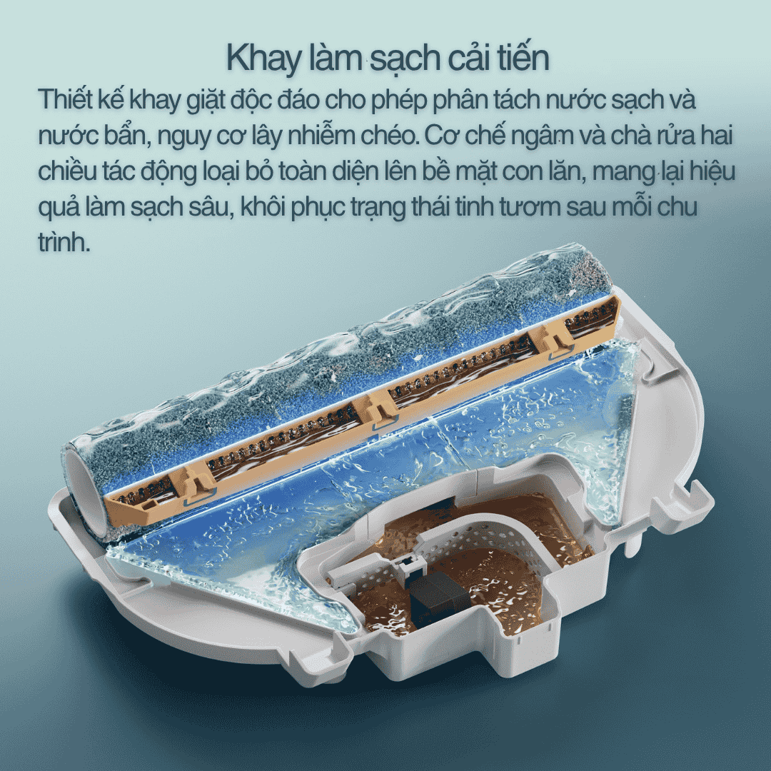 Lưỡi gạt áp sát liên tục loại bỏ nước bẩn khỏi con lăn và dẫn về khoang chứa, đảm bảo robot luôn lau bằng nước sạch 100%, không mùi, không ẩm.