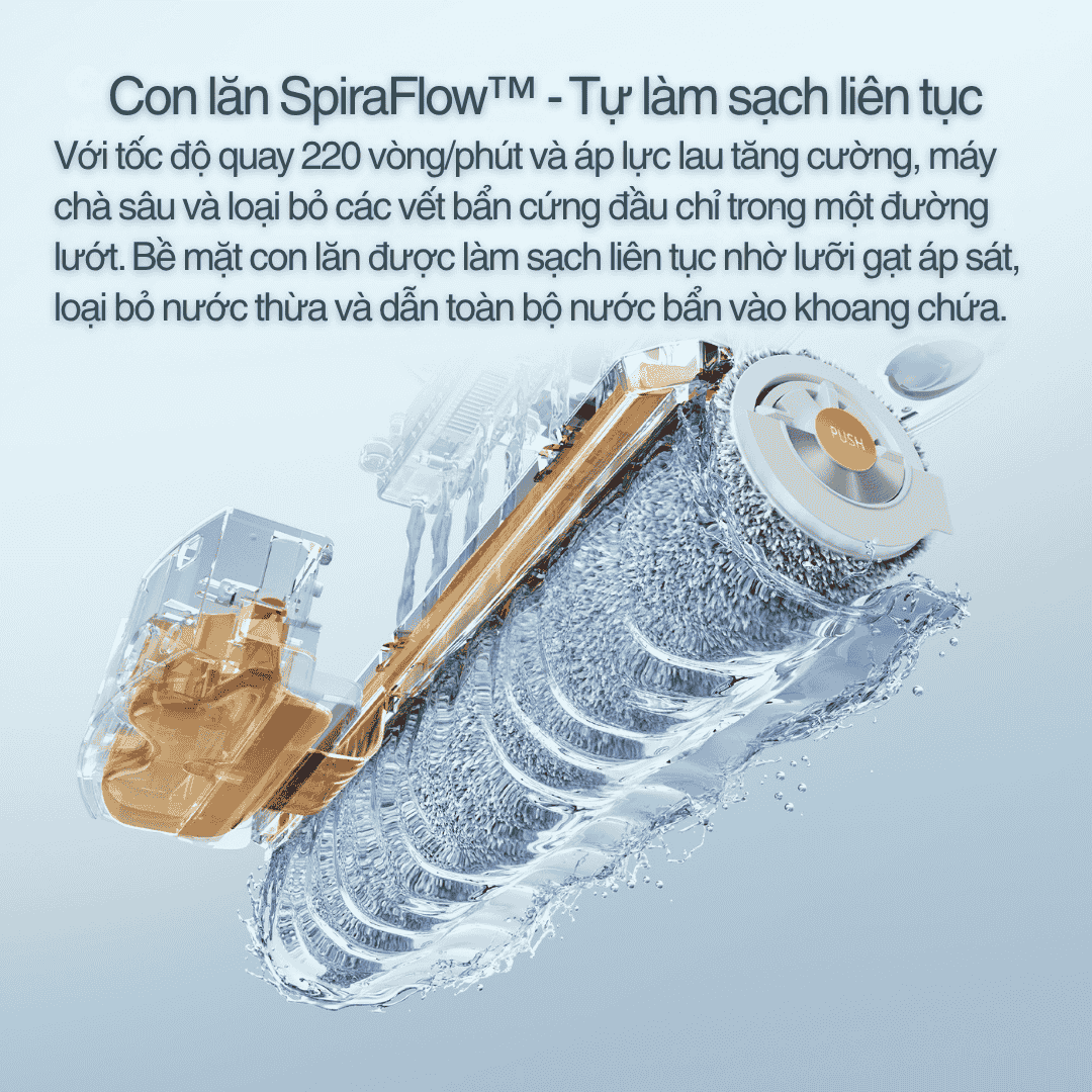 Với tốc độ quay 220 vòng/phút và lực ép mạnh, SpiraFlow™ chà sâu và loại bỏ hoàn toàn các vết bẩn cứng đầu chỉ trong một đường lướt.