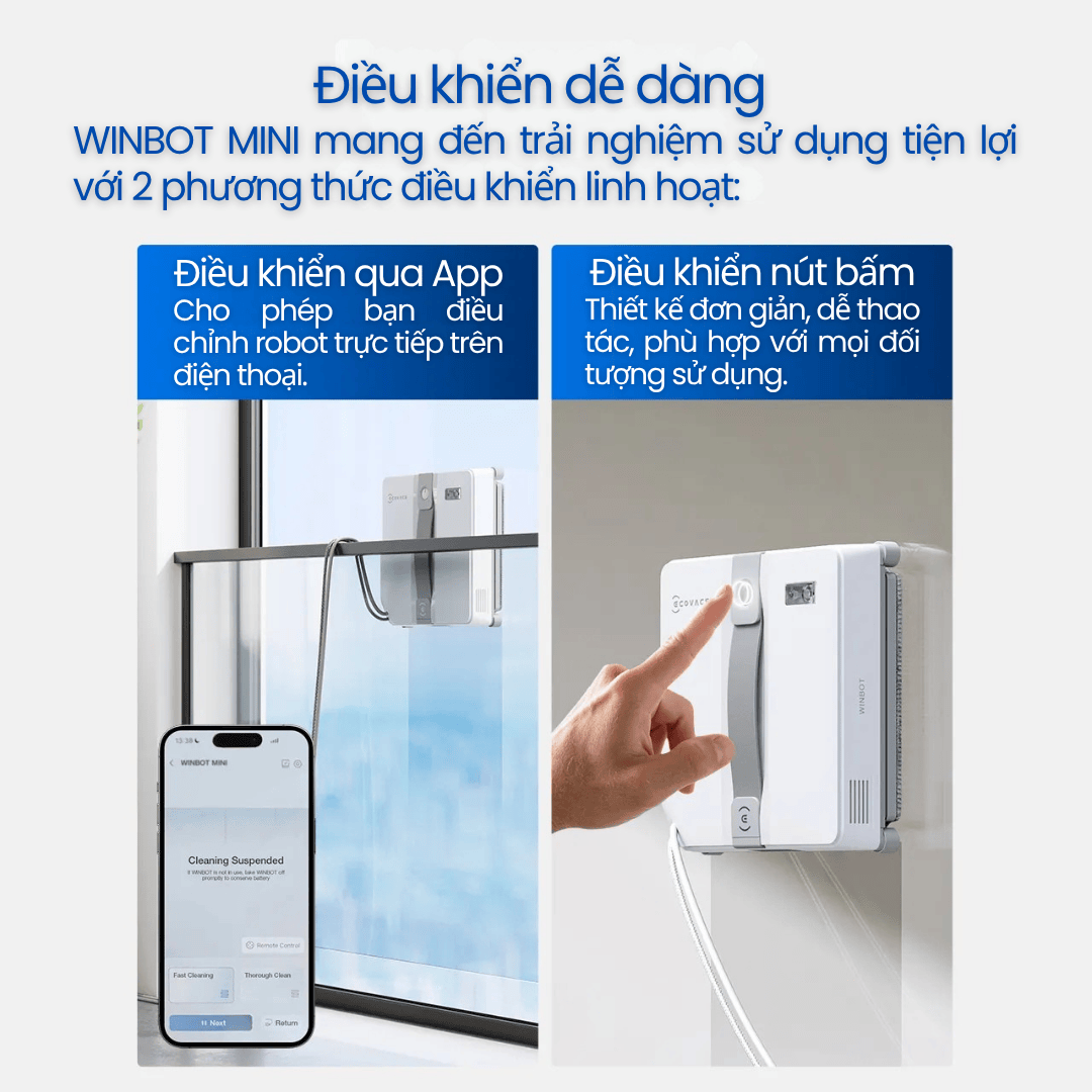 WINBOT MINI là giải pháp lau kính nhỏ gọn, thông minh và an toàn cho mọi gia đình hiện đại. Với thiết kế mỏng nhẹ, lực hút mạnh 7.500Pa, công nghệ phun sương siêu âm, định tuyến thông minh WIN-SLAM 3.0 và hệ thống bảo vệ 9 lớp, robot đáp ứng mọi nhu cầu từ lau nhanh, lau sâu đến làm sạch điểm bẩn.